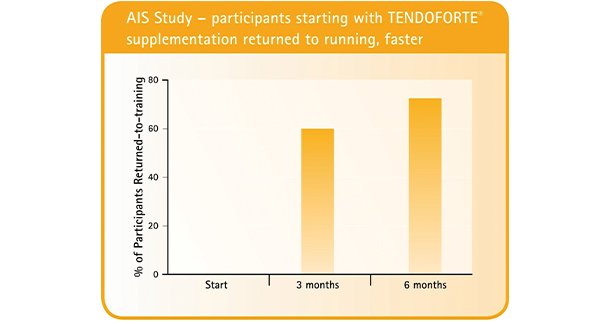 Every sport requires some degree of strength, power and speed, and relies heavily on tendons and the intact composition of their extracellular matrix collagens, proteoglycans and elastic fibres. However, overuse can make tendons and ligaments more susceptible to injury. That’s why GELITA’s special TENDOFORTE® collagen peptides are optimised to strengthen them. Two studies conducted with these BCP® show efficacy with a daily dose of just 5g over 3 to 6 months. A study conducted by the Australian Institute of Sport (AIS) showed that subjects with long-term symptoms of chronic Achilles tendinopathy who had failed to respond to traditional rehabilitation methods were able to return to running within 3 months when supplementing with TENDOFORTE®, and were able to continue running for the remainder of the 6-month trial period.[5]